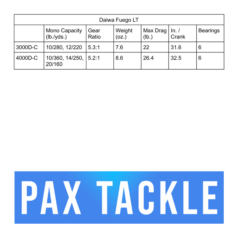 Fuego LT series of spinning reels, state of the art fishing tools that define Daiwa’s commitment to the LT Concept of lighter, tougher material. With conventional, heavier spinning reels, long hours of casting and retrieving can fatigue the arms and hands.The Fuego LT housing is light but sturdy constructed from a Carbon based material. The innovative Magsealed main shaft delivers butter smooth performance while preventing water or dirt intrusion. The technology uses a Mag Oil that can be magnetically solidified similar to a packing on a boat’s propeller shaft. Oil smooth operation as well as a water and impurities barrier makes the design and function unparalleled. The Machined Aluminum handle is ergonomically correct and screws easily into the body. Six ball bearings and one roller bearing combine to create the ultimate in silky smooth operation. If you are looking for an amazing reel packed with high-end design and technology features then the Daiwa’s Fuego LT may be the reel for you.